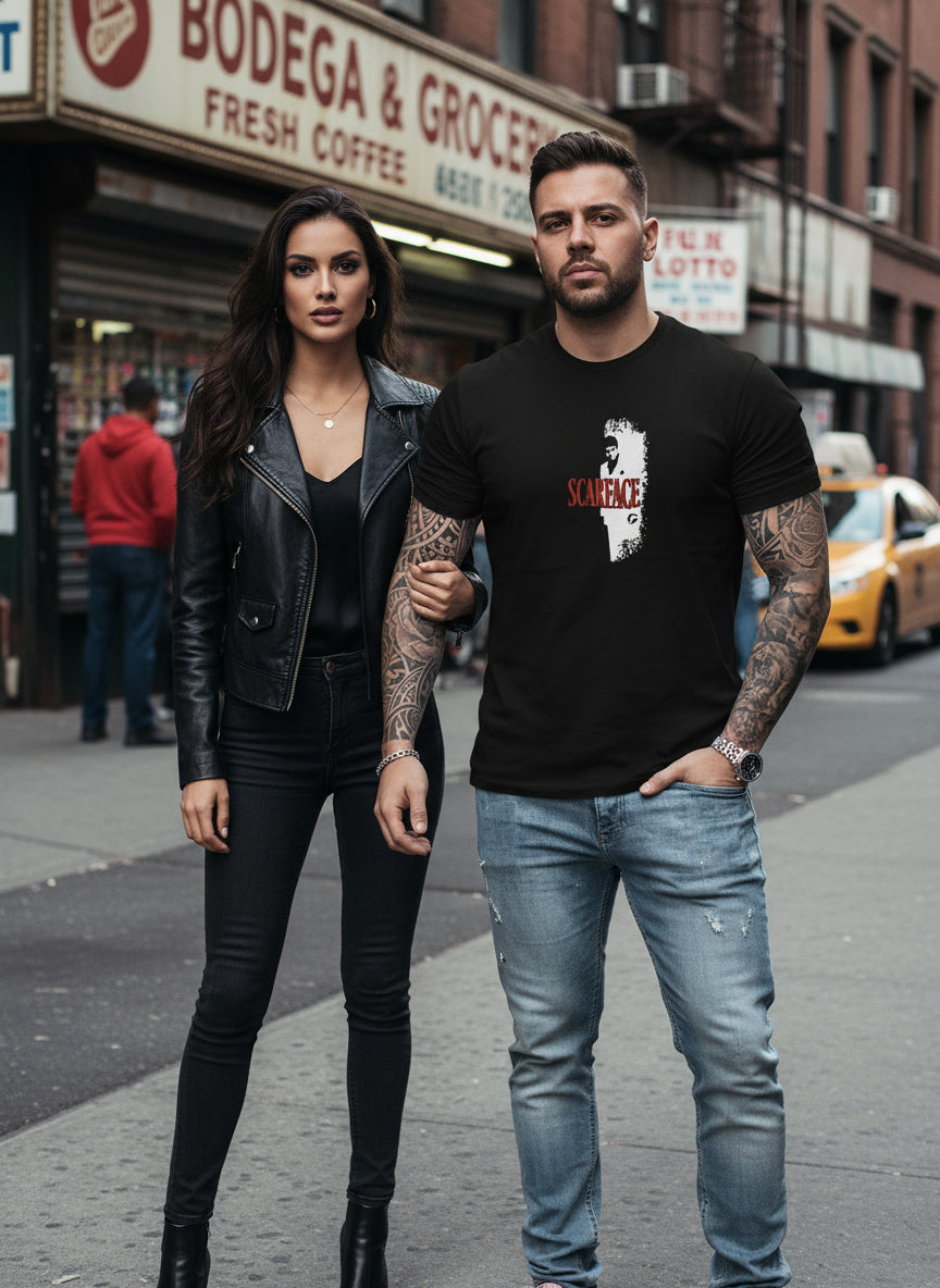 Make a fearless fashion statement with this men's t-shirt that boldly celebrates the raw intensity of iconic crime cinema. Inspired by the most notorious characters in film history, this piece channels unapologetic swagger and cinematic rebellion. For those who dare to wear their passion for gritty storytelling and antiheroes with confidence—a shirt that commands attention and sparks conversation.